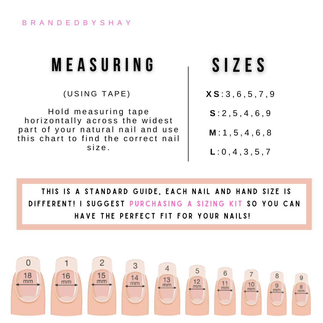 Please make sure you size your nails correctly, as we cannot be held responsible for wrong sizes ordered. If you are unsure of sizing you can order a Sizing Kit.
